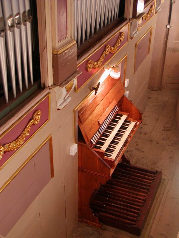 View of console including pedalboard - note the polished 'tin' lips of the facade pipes